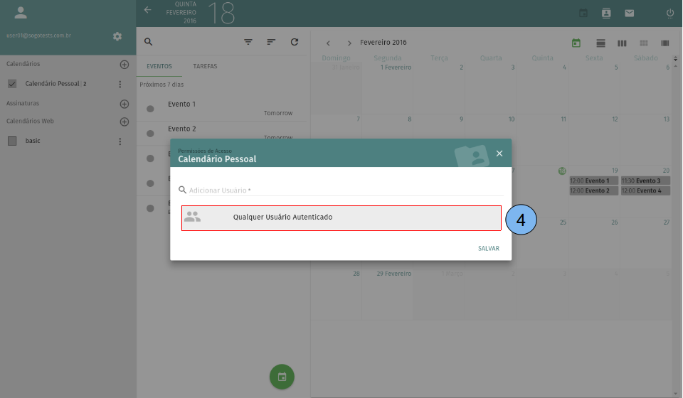 Configurar permissões de acesso de um usuário especifico aos calendário.