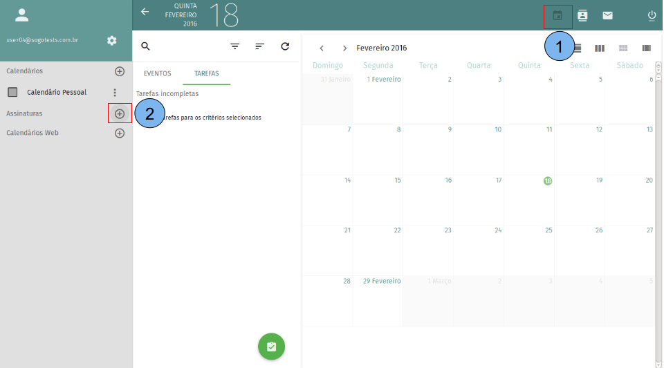 Ao se inscrever no calendário de outro usuário você terá acesso aos eventos e tarefas do mesmo. As permissões disponíveis vai depender do nível de restrição que o usuário (dono do calendário) definiu no mesmo. (1) Acesse Calendário. (2) Em “Assinatura” clique no sinal de “+”.