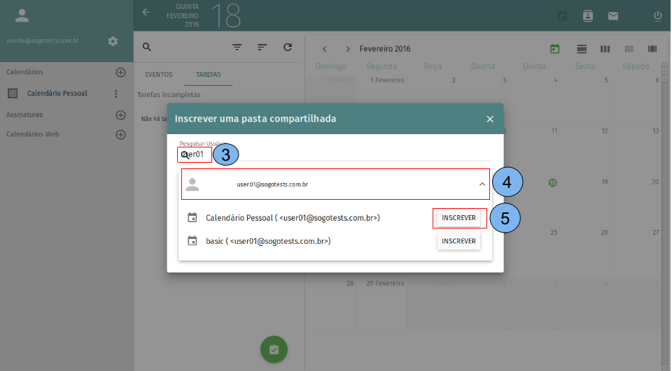 (3)Na barra de pesquisa digite o endereço de e-mail do usuário ao qual você deseja se inscrever. (4) Clique no usuário desejado. (5) Clique em “Inscrever” no calendário ao qual você vai se inscrever.