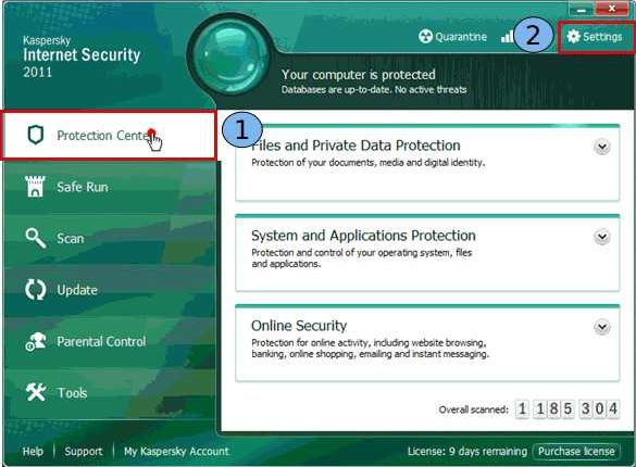 Clique no ícone Kaspersky na “Barra de tarefas”, siga o procedimento abaixo: Ao abrir a janela do aplicativo, à esquerda da janela principal do aplicativo, selecione “Centro de Proteção” (1). No canto superior direito da janela principal do aplicativo, clique no opção “Settngs” (2).