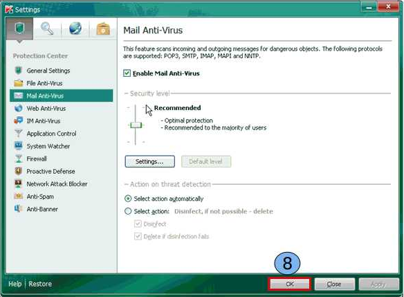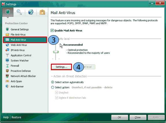 À esquerda da janela Configurações, selecione “Email Antivírus” (3). À direita da janela Configurações, clique no botão “Settngs” (4).