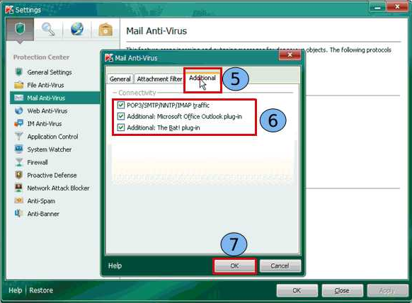 Na janela Antivírus de Email, vá para a guia “Adicional” (5). Desmarque a caixa Adicional (6) :