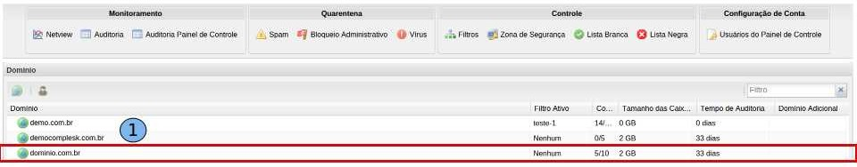 Após acessar o Painel de Controle http://painel.dominiodehospedagem.com.br/ siga os procedimentos: Ao acessar a “Página Inicial” do painel de controle, dê um duplo clique no domínio “dominio.com.br” (1).