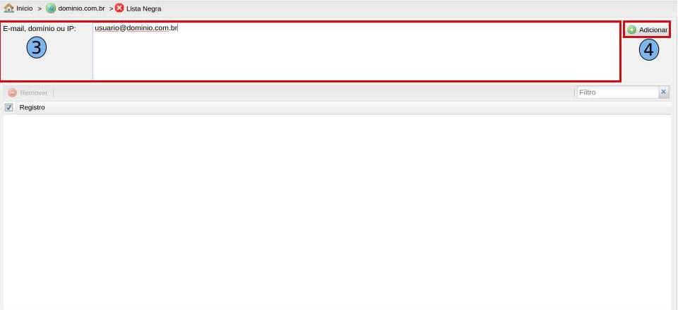 No campo “E-mail, domínio, IP” (3) adicione o endereço de e-mail, domínio ou IP que deseja adicionar na “Lista Negra”, logo depois clique em “Adicionar” (4)