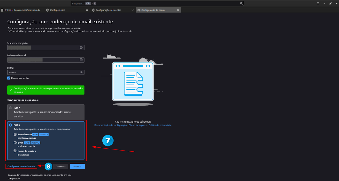 Marque a opção de POP3 (7) e em seguida clique em Configurar Manualmente (8).