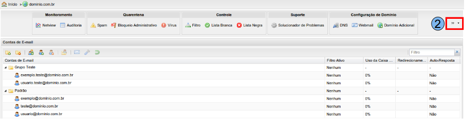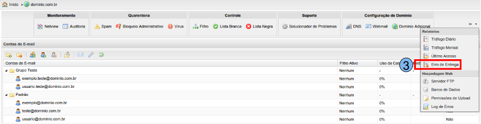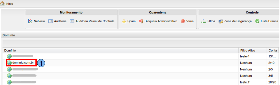 Para iniciar o processo de visualização do relatório de erros na entrega de e-mails, na tela inicial do Painel de Controle, localize o domínio desejado, neste caso, será utilizado “domínio.com.br” (1), clique duas vezes sobre o mesmo.