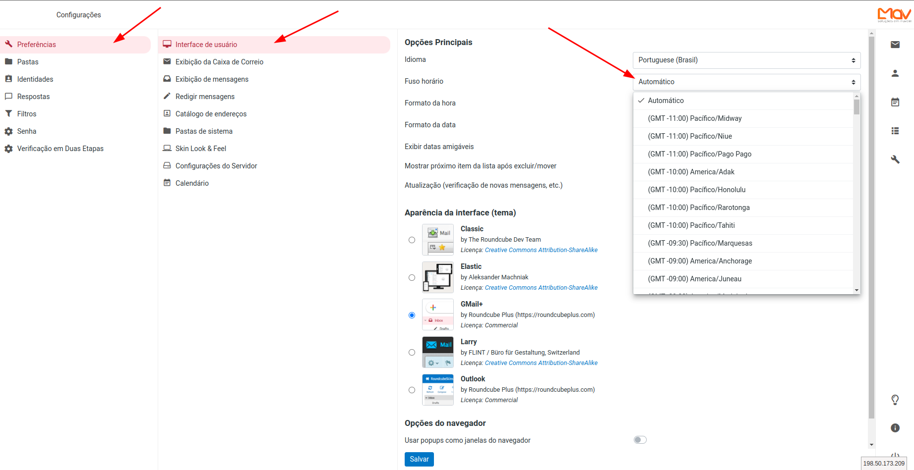 Quando o webmail está com o fuso horário Automático a mensagem pega o fuso horário do computador. Dessa forma a lista de e-mail do Webmail pode apresentar um horários diferente do horario corretente.